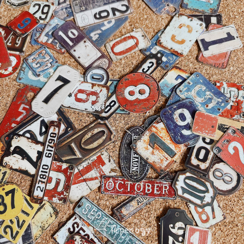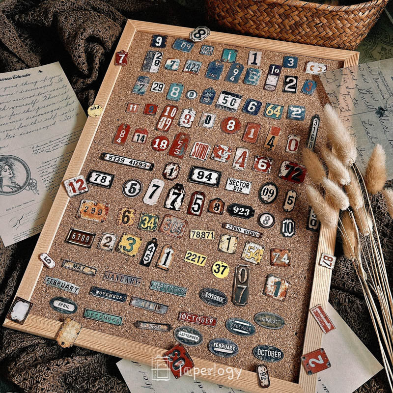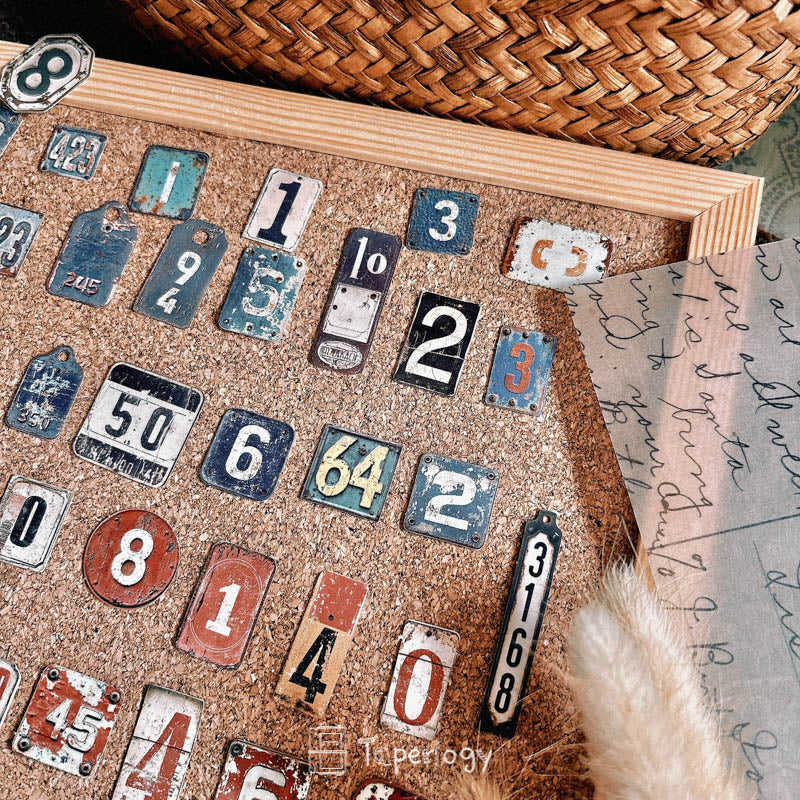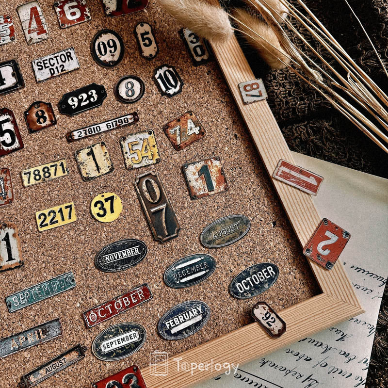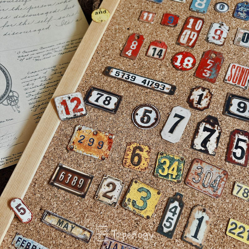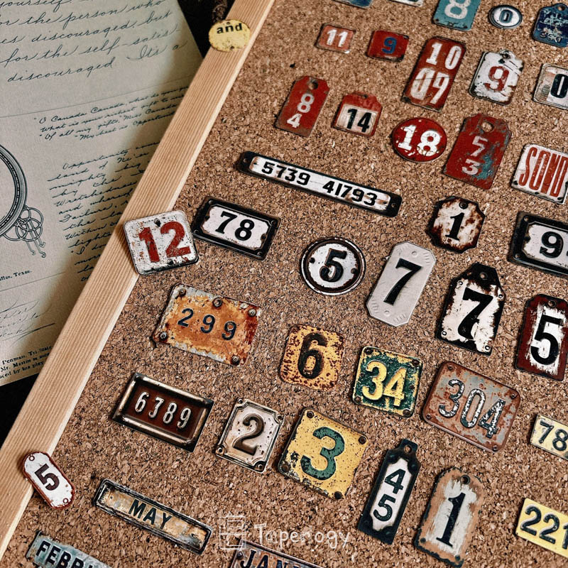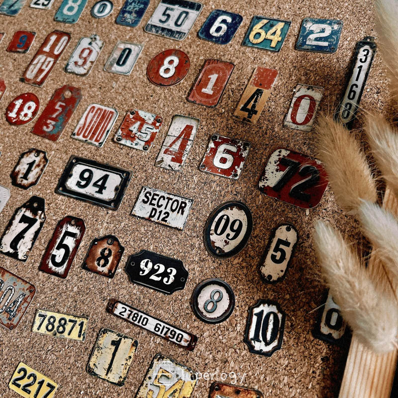 Featuring a wide variety of styles, shapes, and colors, these stickers are designed to mimic the look of old metal signage, license plates, industrial labels, and retro typography. From weathered reds and rusted browns to worn-out blues and punchy yellows, each piece tells a different story. Some are numbered, while others stamped with months or codes, offering endless creative possibilities.