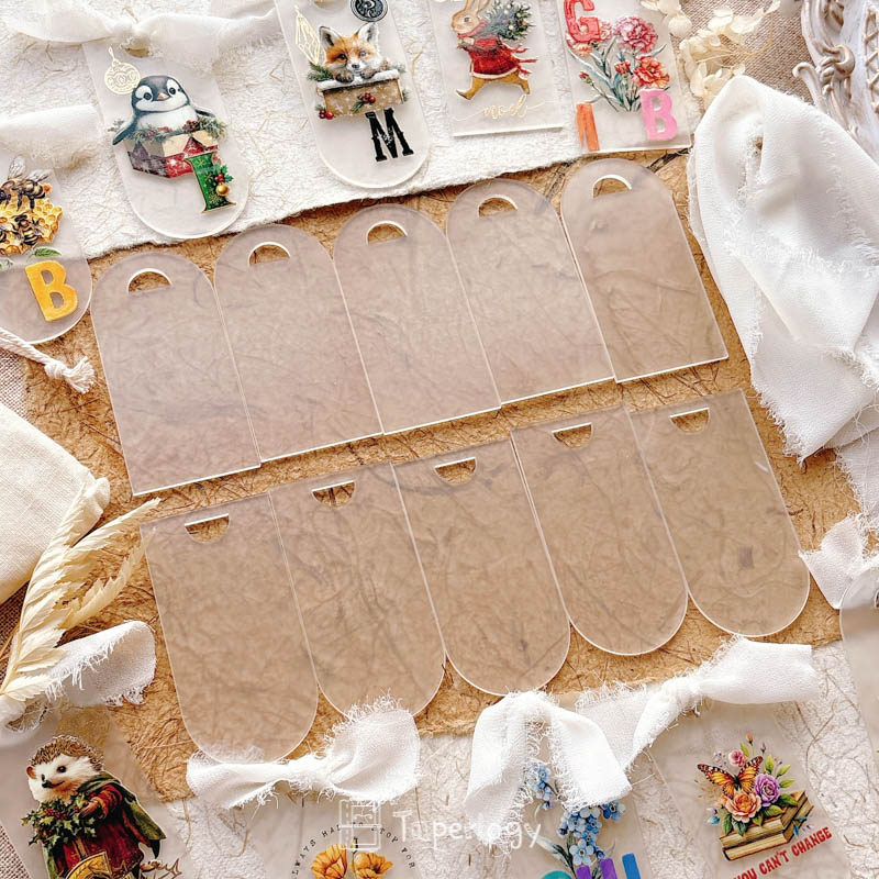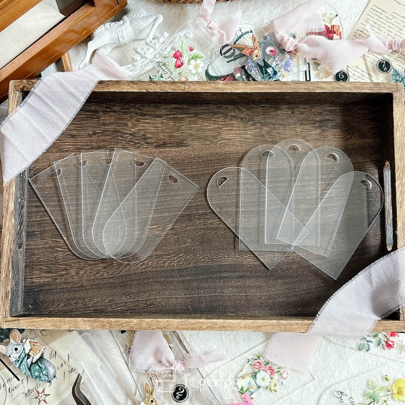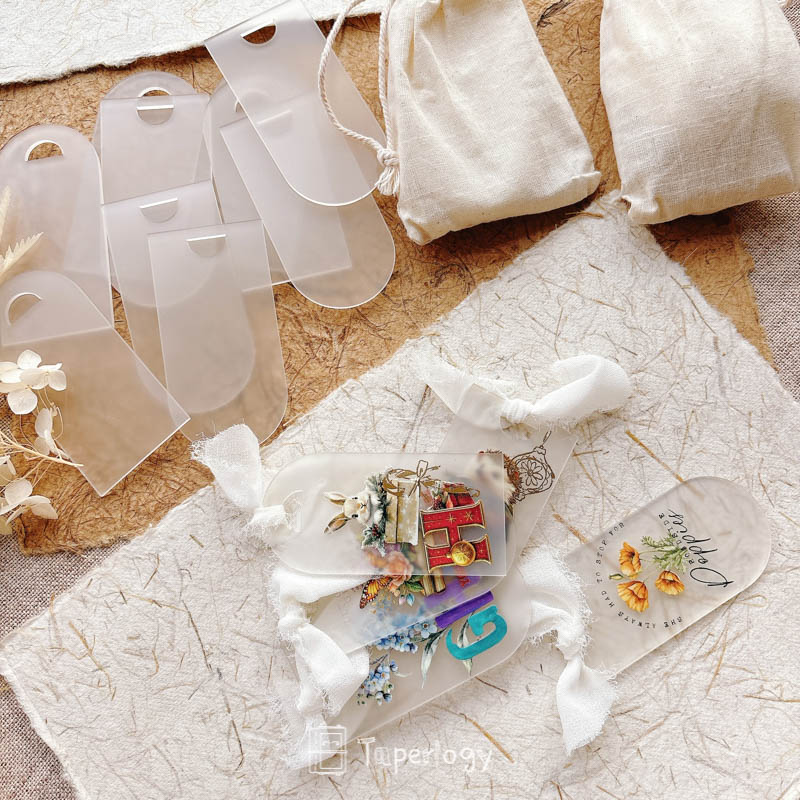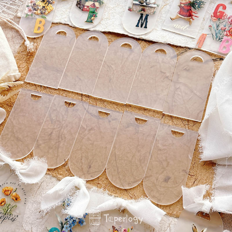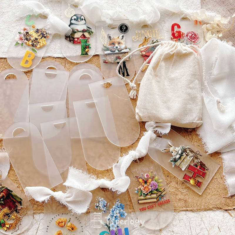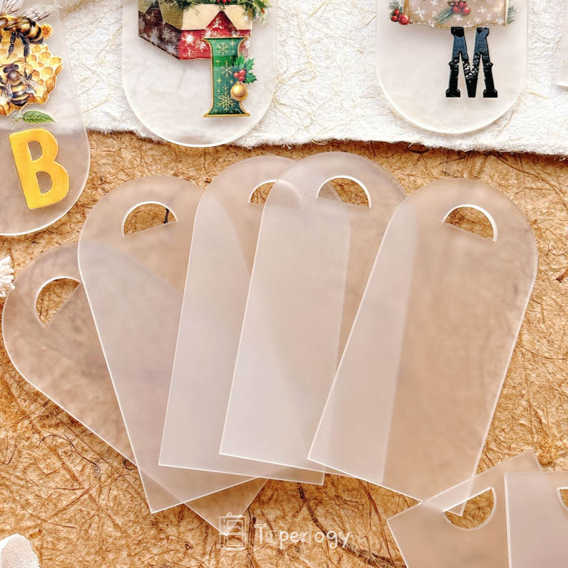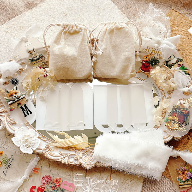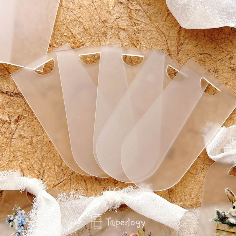 Each set includes 10 acrylic tags and a 2-meter roll of soft, frayed ribbon for adding a lovely finishing flourish.  Pick between two acrylic finishes: a crystal-clear version or a matte translucent option that diffuses light beautifully!