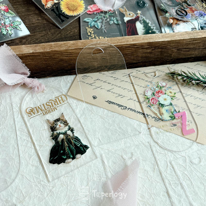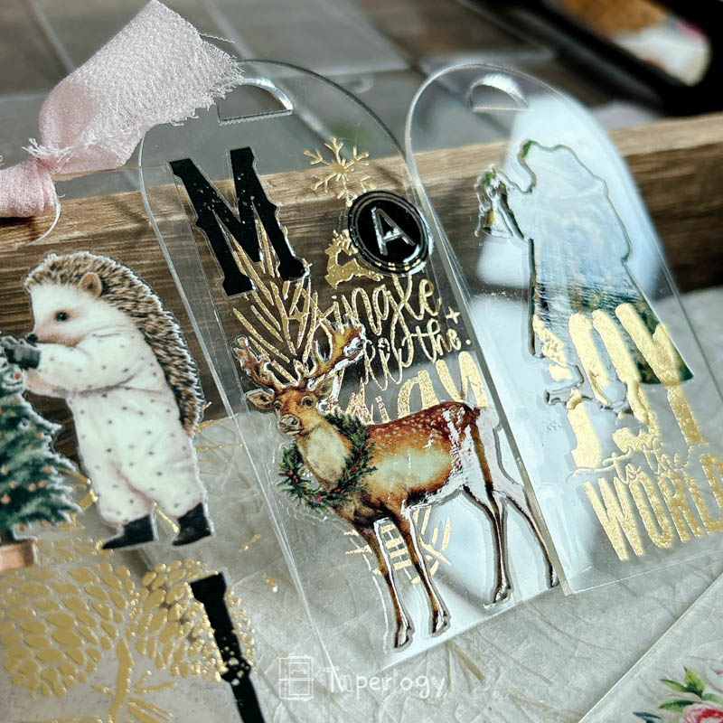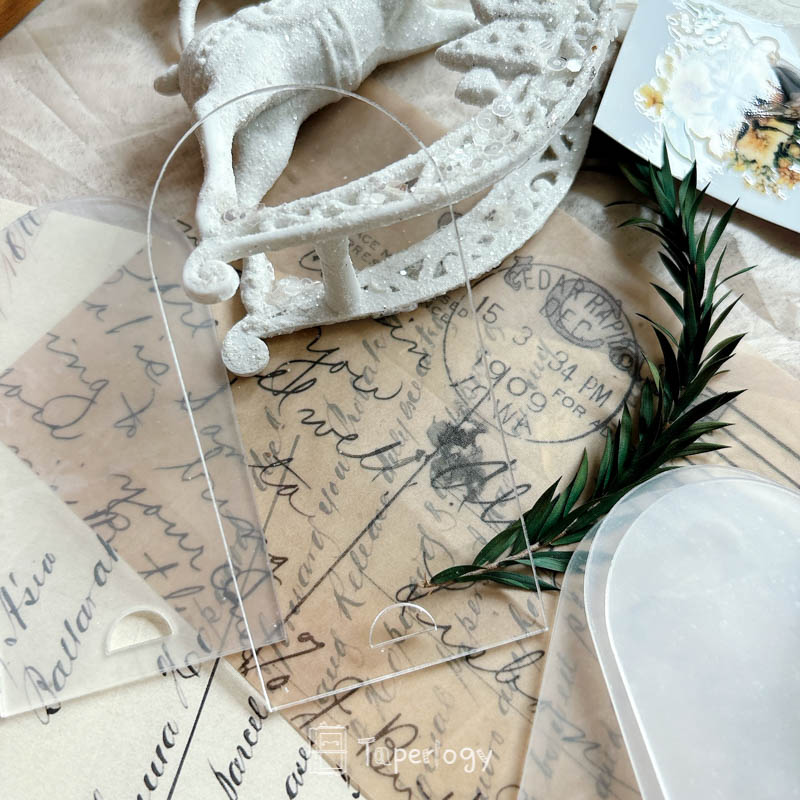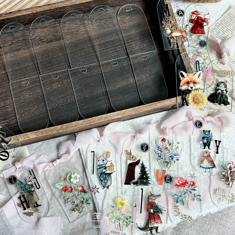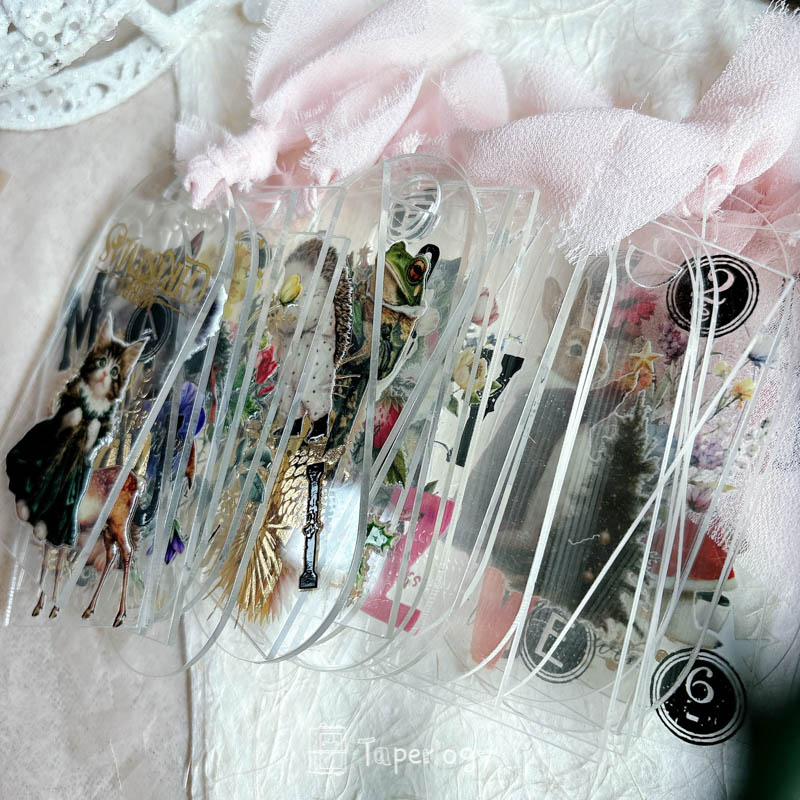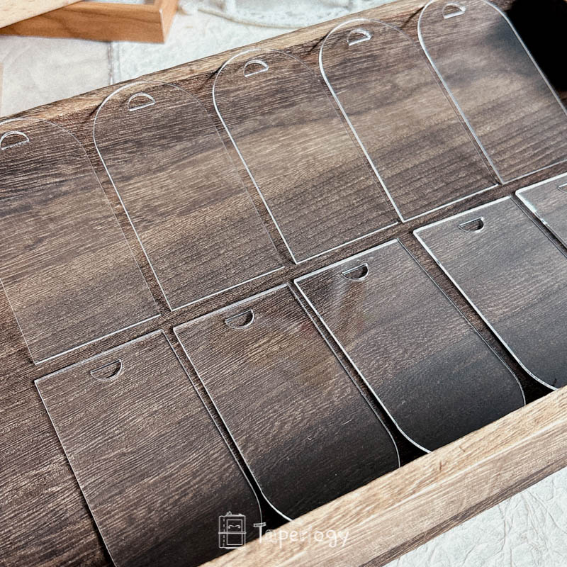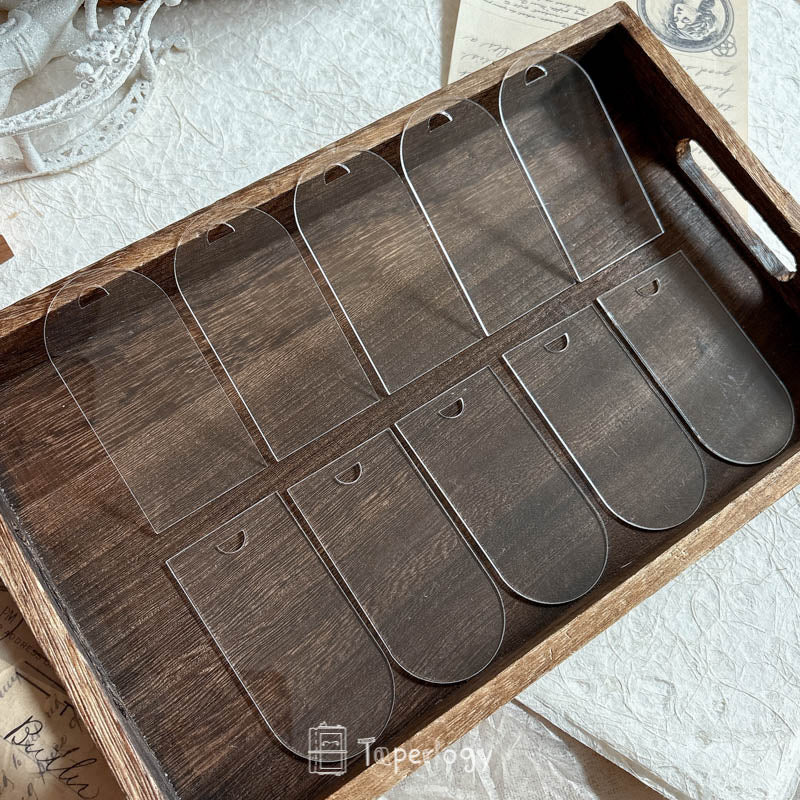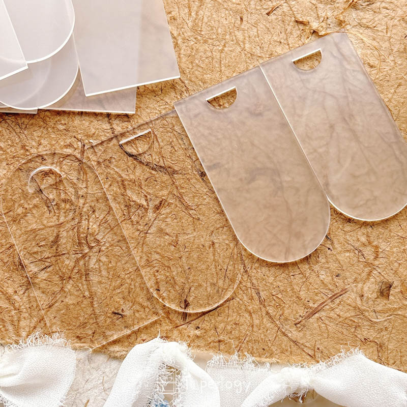Each set includes 10 acrylic tags and a 2-meter roll of soft, frayed ribbon for adding a lovely finishing flourish.  Pick between two acrylic finishes: a crystal-clear version or a matte translucent option that diffuses light beautifully!