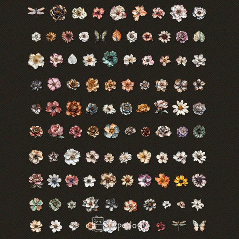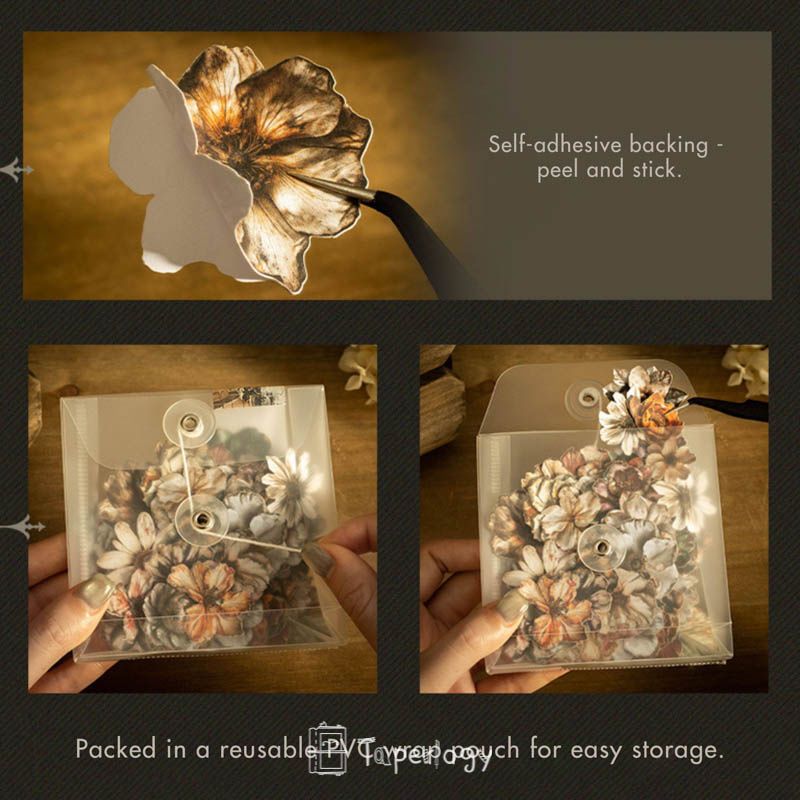 Each pack includes 100 individual flower pieces, carefully illustrated with rich, vintage-inspired tones and printed on thick card paper for a premium, tactile feel. With edge-to-edge printing, there are no white borders to give each piece a realistic, handcrafted look that blends seamlessly into journals, scrapbooks, cards, tags and other mixed media projects. The flowers also come in a variety of sizes and with adhesive backing, making them perfect for layering, focal points, or delicate finishing touches.