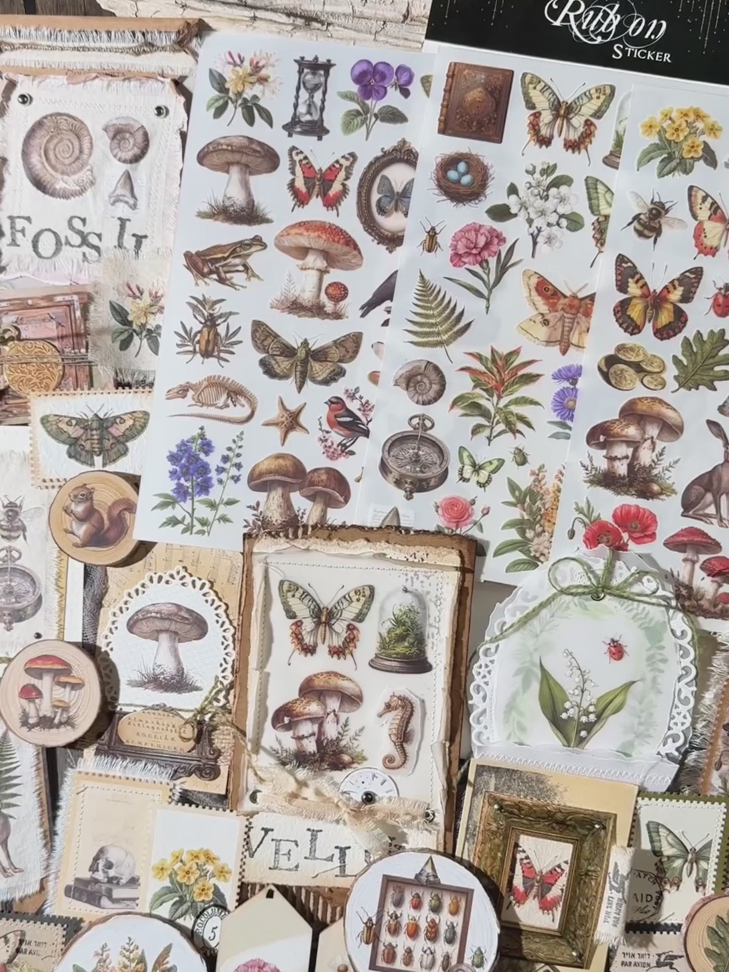 This rub-on sticker collection brings together flora, fauna, and scientific curiosities, all illustrated with a vintage research aesthetic. From pressed botanicals to forest discoveries to winged specimens, you'll find tiny details in these stickers, similar to those you'd expect to find inside an explorer's field journal!