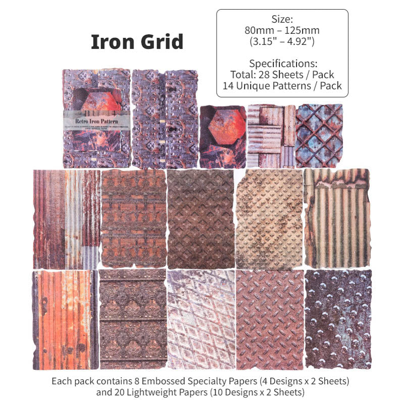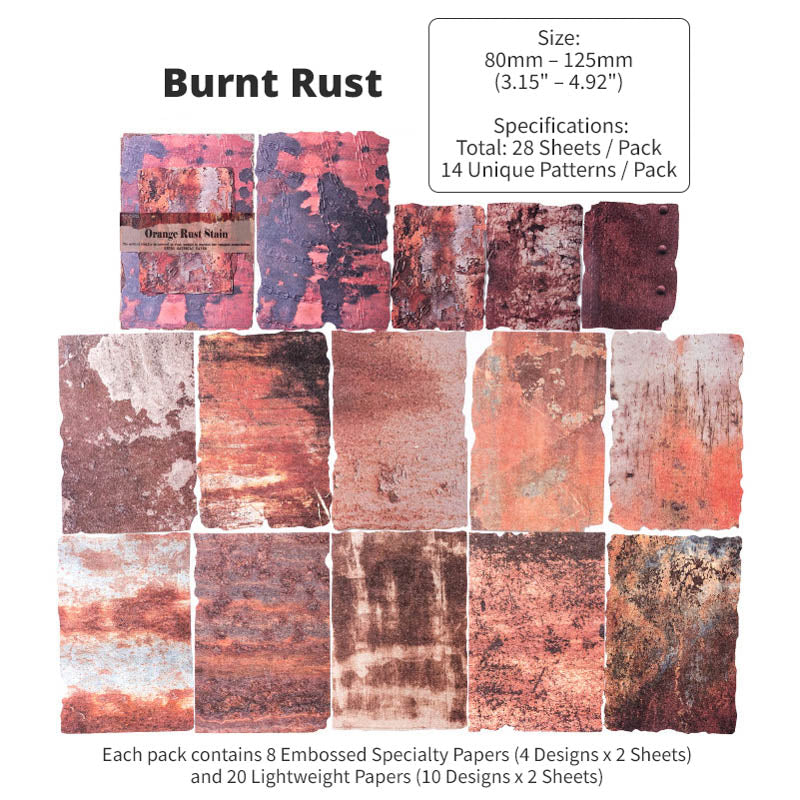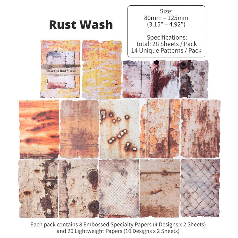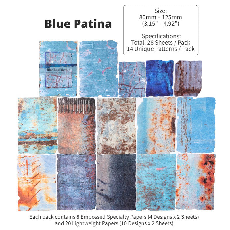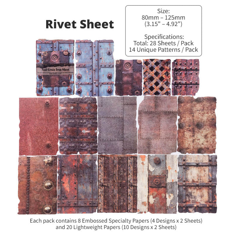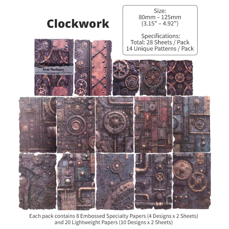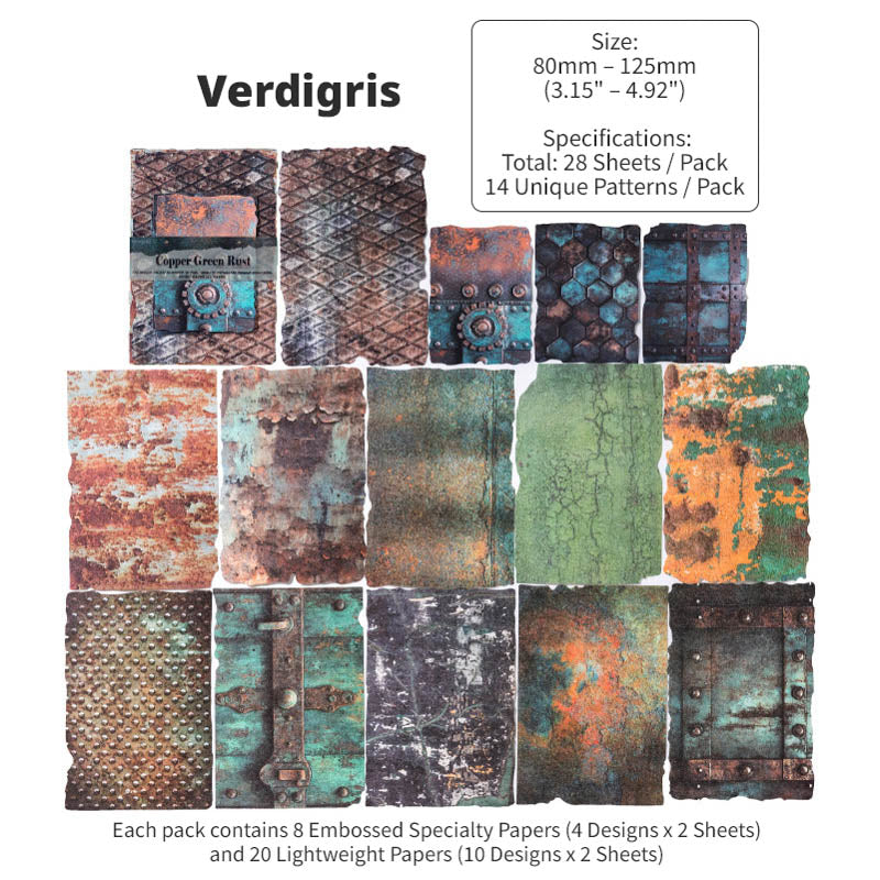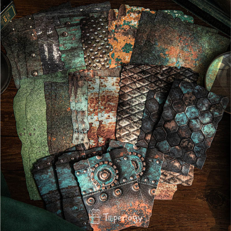With 8 different themed packs to choose from, each pack features a curated mix of embossed specialty papers and lightweight textured papers. Inspired by aged metals, rusted machinery, weathered surfaces and industrial patina, you'll find moody spreads, steampunk compositions and bold contrasts in every pack. With an intentionally worn and distressed design, these papers are richly detailed with real tactile dimension, perfect for layering in journals, collages, scrapbooks and mixed-media projects!