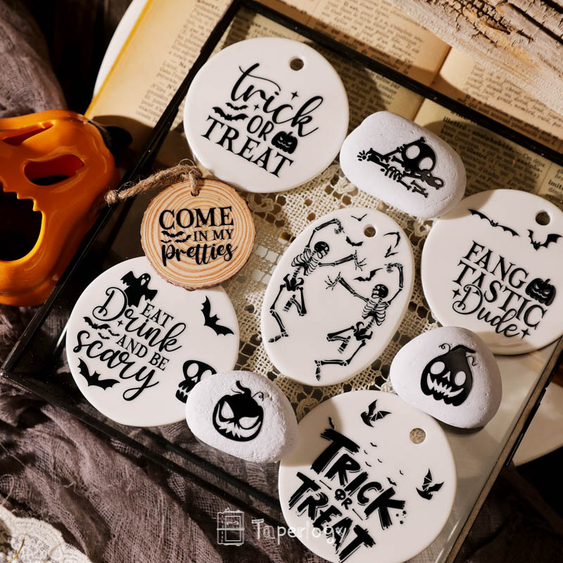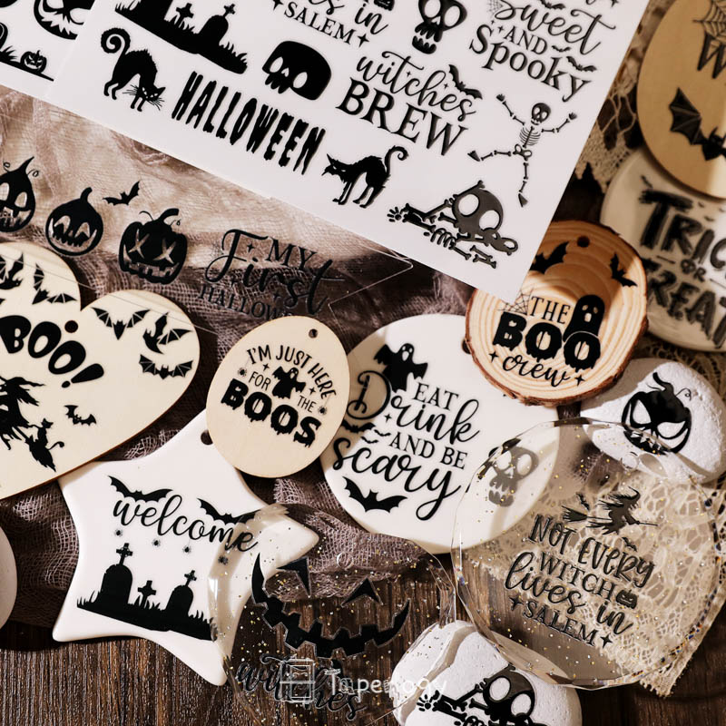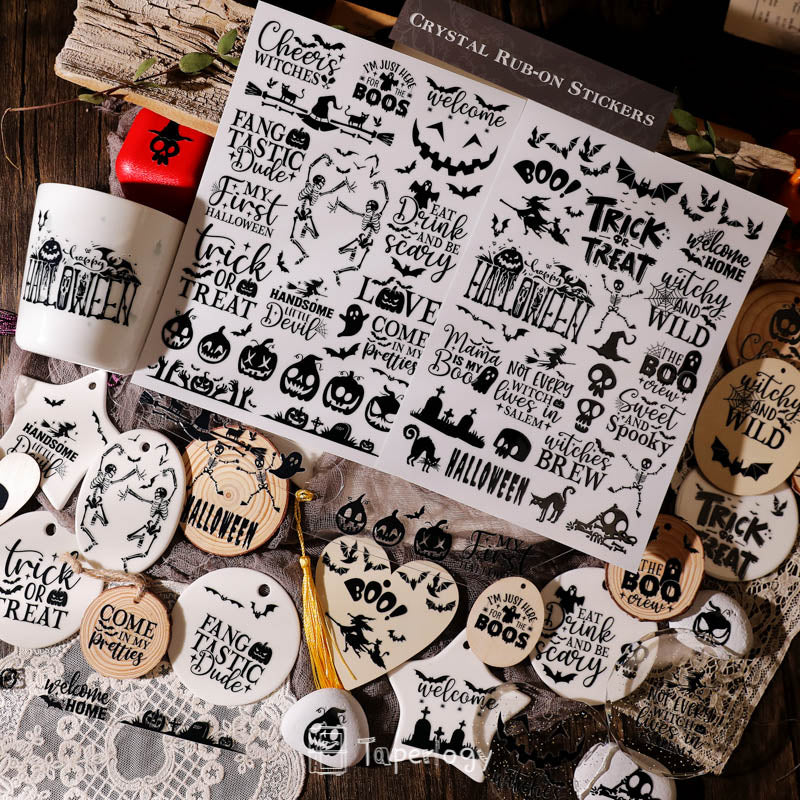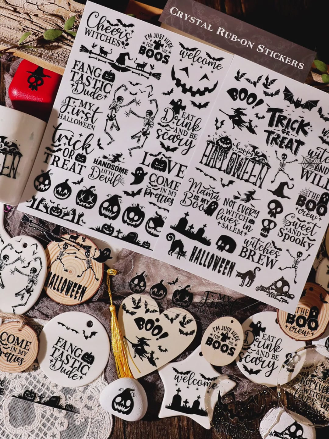 Dank des klaren Schwarz-Weiß-Stils setzen diese Kristall-Rub-On-Sticker auf Acrylanhängern, Geschenktüten, Kerzen oder Halloween-Mitgebseln einen auffälligen, schaurigen Akzent auf jede Oberfläche!