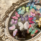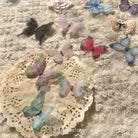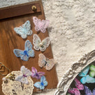 Es enthält 20 einzigartige Verzierungen – eine zauberhafte Mischung aus gestickten Schmetterlingen und transparenten Stoffmotiven. Jeder Schmetterling ist mit leicht angewinkelten Flügeln gestaltet, die ihm einen lebensechten, dreidimensionalen Effekt verleihen.