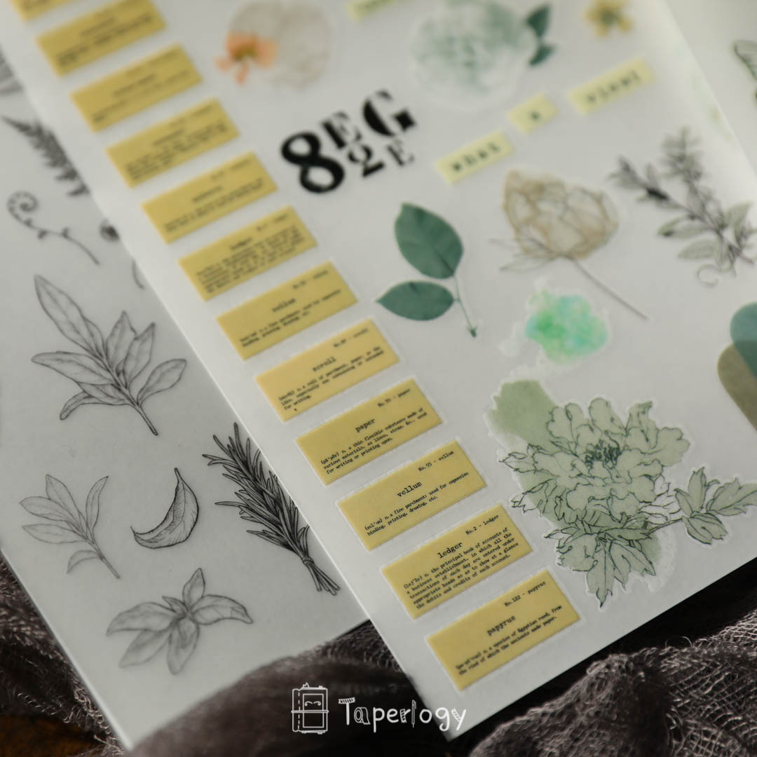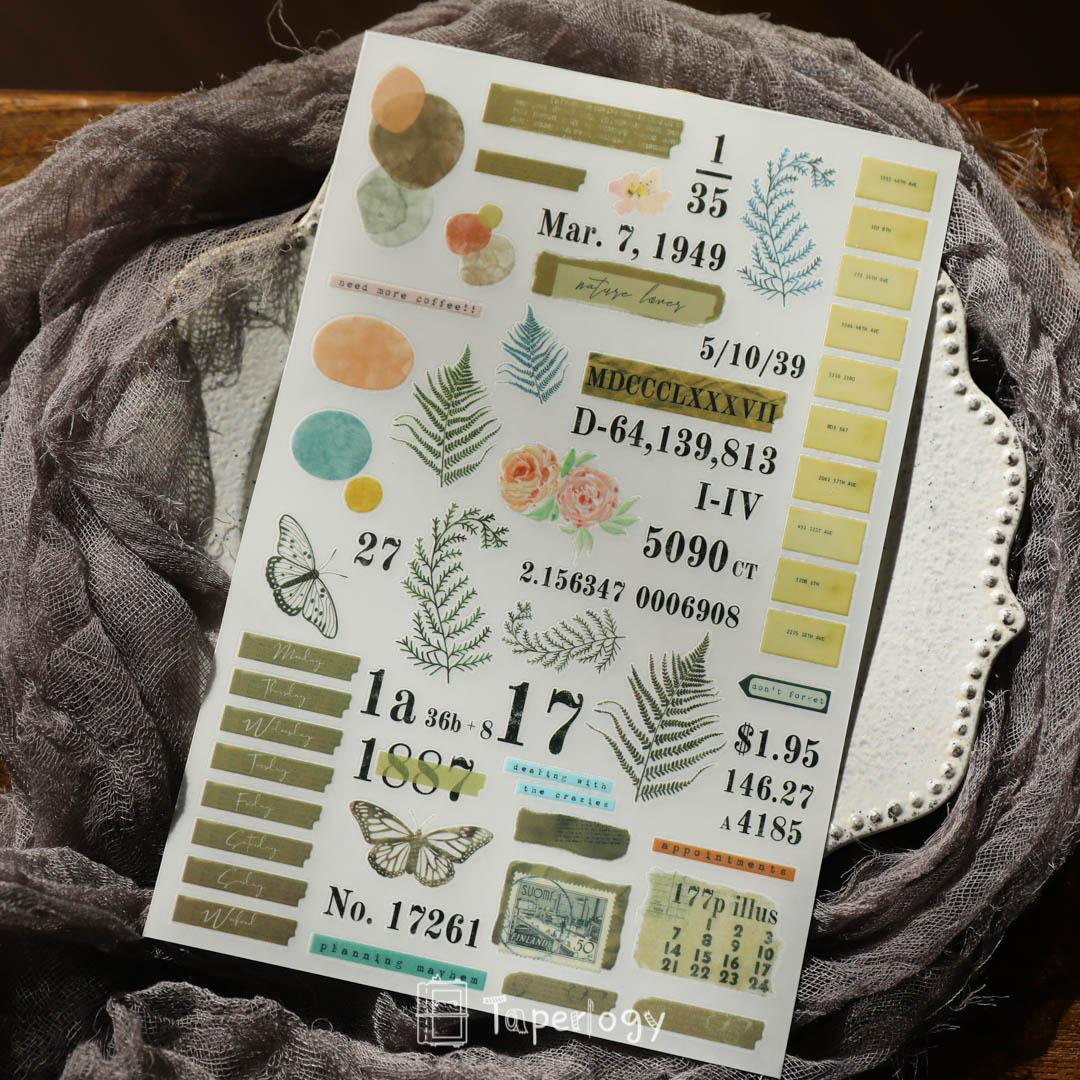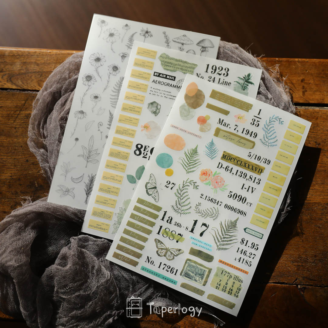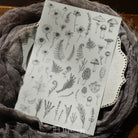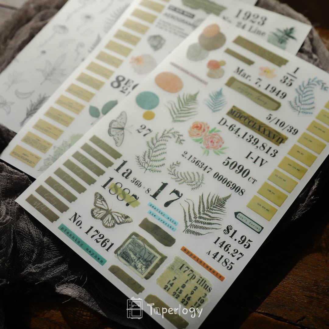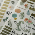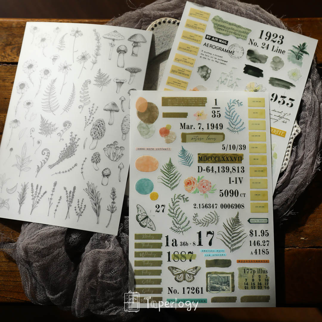 These rub-on sticker sheets are the ultimate mixed pack! Each sheet contains a variety of unique design elements, including alphabet, wording, tags, black and white plants, ferns, flowers, and various shapes. These stickers are perfect for overlaying onto your journal pages or planner layouts to create stunning visual effects.