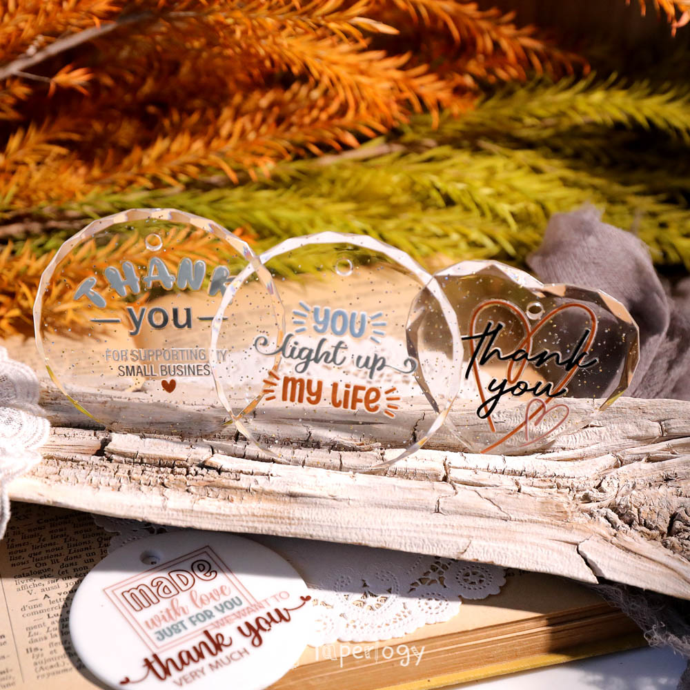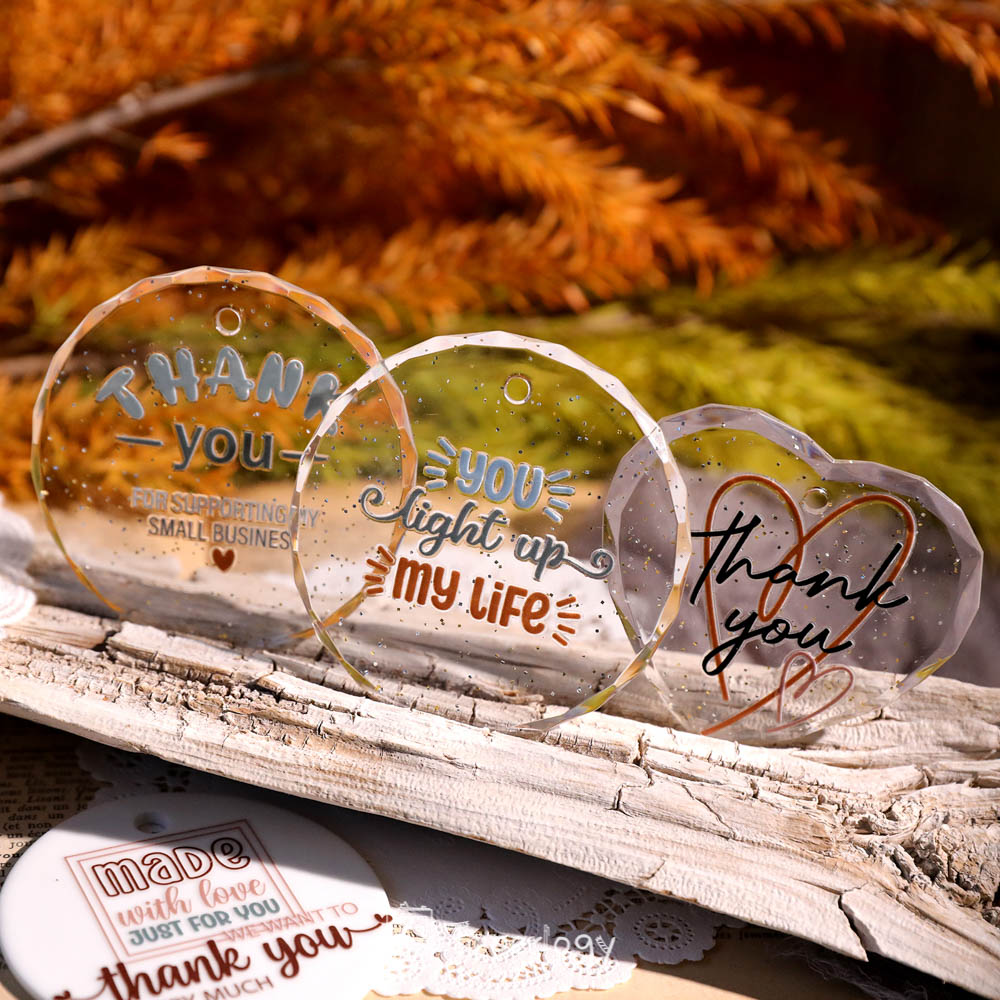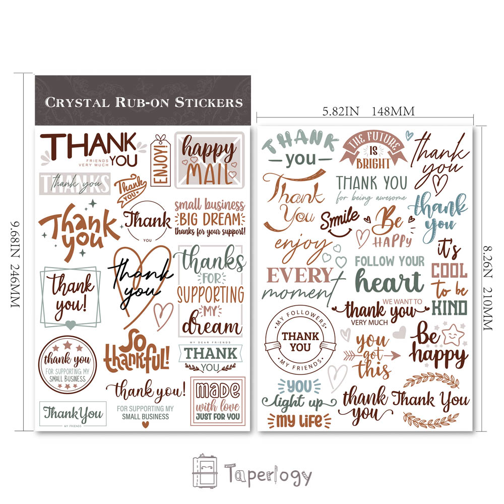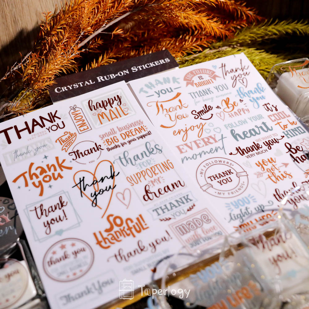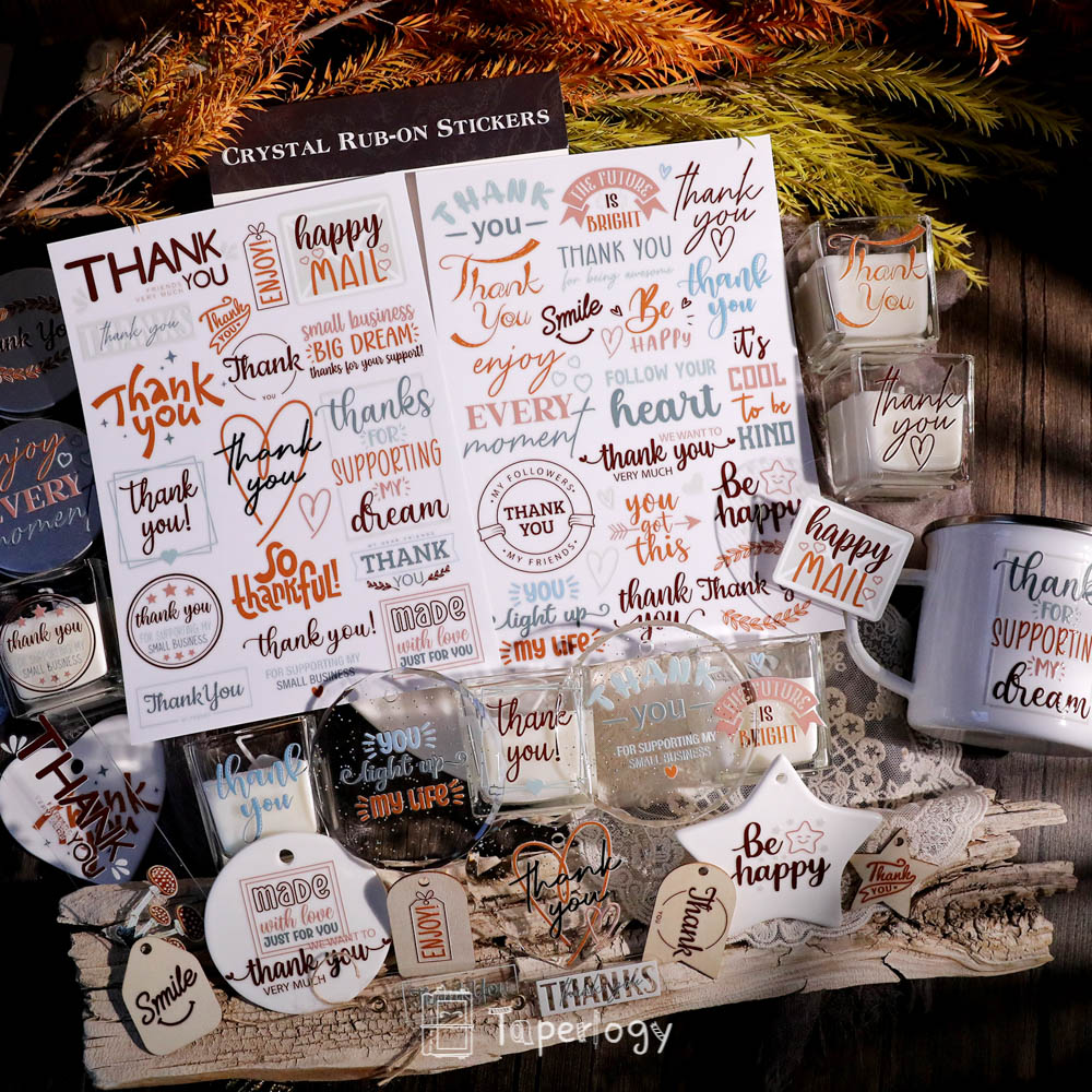 Express your gratitude in style with our Thankful Touch Crystal Rub-on Stickers! This elegant collection features the phrase “Thank You” in a variety of stunning fonts and typographic designs, along a few other different phrases. Every phrase is enhanced with unique flourishes and delicate details.